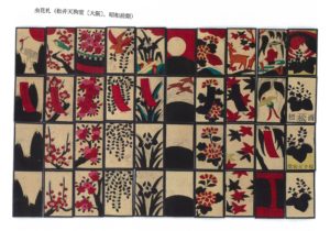京都の職人集団の作る「八八花札」は、大阪の職人集団の作るものとは図像が多少は異なっていた。私は、とくに①紋標「梅」の梅枝にとまる鶯が、大阪製のものでは小鳥で、京都製のものでは大鳥であること、②紋標「紅葉」の鹿が、大阪製のものでは小さくて動きがあるのに対して、京都の鹿はかるた札一杯に大きく展開されており、まったく奥行きのない平面的な図像であること、この札の右端にある紅葉の樹木の表現が異なること、③紋標「柳」の小野道風のある札の小川が、大阪製のものでは右奥から道風の横を通って左手前に流れているのに対して、京都製のものでは左から道風の奥を通って右手前に流れていること、を区別のポイントとして考えている。「梅」「紅葉」「柳」が鑑定のポイントだったのである。