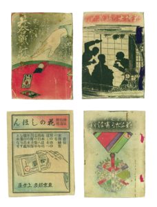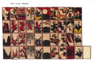 なお、ここで、「八八花札」の画像の成立について述べておこう。東京銀座の上方屋は、当初は、大阪の「天狗屋」の後継者を名乗る、「天狗堂」ないし「大阪天狗堂」の作る、かるた札の図像から和歌を廃した東京好みの花札を商うかるた販売業を始めたのだが、爆発的に拡大する需要に応じるために商売を拡大し、京都のカルタ屋を介して京都の職人が作る花札も商うようになった。