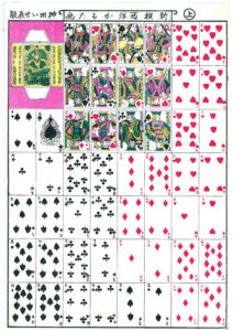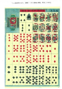 なお、明治十八年(1885)の年末に「團團社」が発行した日本最初のトランプ遊技の解説書の表紙には六枚のカードが描かれているが、すでに上で検討したようにグッドオール社のものを模写している。また、この時期に、東京のおもちゃ絵制作業者が、子ども向けに一枚ものの「西洋かるた絵」を制作している。明治十九年(1886)の山崎版「志ん板西洋かるた」(翌年再版のものもある)、明治二一年(1888)の山口版「西洋かるたの絵」(部分)、同じく明治二十一年(1888)の加々吉版「新版西洋かるた」、刊年不明の伊勢辰版「新板西洋かるた画」などである。これらは、画像の特徴から、アメリカ製ないしベルギー製の安価なカードを模写したものと思われる。これらのカードが輸入されていた事情の間接的な証拠となる。