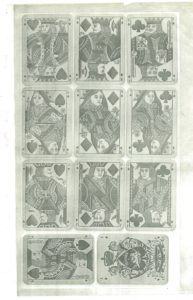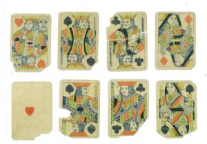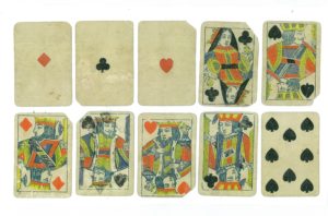 もう一組のカードは、ダメージが大きくて三十五枚しか残されていない。これも、紺色の印刷の上から、朱色、黄色、黒色がステンシル技法で彩色されていて、ダブルヘッド、ノーインデックス、ラウンドコーナーという点はグッドオール社のものと同じである。数札がダブルヘッドになっている点は今日のカードに一歩近いが、同じ「クラブ」「スペード」「ダイヤ」「ハート」の紋標を用いたフランスのカードでは古くから数札もダブルヘッドになっているので、それに従ったのかもしれない。デザインは上品でバランスが良い。紙質や背面の斜線の模様などからしてベルギー製であるように見えるが、このカードにも「スペードのエース」が欠けていて確証はない。