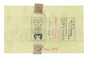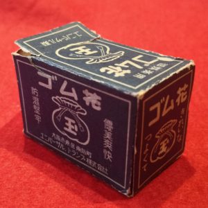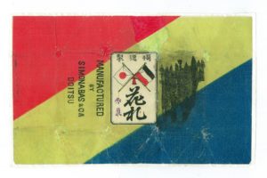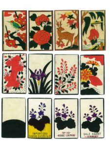このヨーロッパ製の花札はイギリス、ロンドン市のカルタ・ディーラーのカタログに掲載されたので購入しようと日本から注文したが、わずかの時間差で日本のカルタ屋の主人が現地で店を訪れて購入したので、ロンドンのディーラーからは、予約があると言ったのに強引に持っていかれたが阻止できなかったことを謝罪するとともに、その日本人カルタ屋が見捨てていった半端な残欠と、包装紙を送ってきた。資料的にはこちらのほうがとても貴重で、①当時、神戸市の外国人居留地百一番館に店を構えていたシモン・エバス(SIMON EVERS)商會がドイツに発注し、②ベルギー、トウルンハウ市のカルタ製作者によって「ゴム引き」で製造され、③「獨逸製」のラベルで包んで日本向けに出荷されたものが横浜港に到着し、④当初は「日本一手発賣元 土田天狗屋 大阪市南久宝寺町四丁目」で販売する予定であったのがどういうわけかキャンセルされて、代わって「大阪市御堂筋淡路町南エ入」の「カネ中 河合福勝堂」によって通関され、⑤上方屋などで販売された、という事情が見えてきた。これに対応するように、ベルギーのカルタ製造史の著作“The Turnhout Playing Card Industry 1826-1976”には、1890年以降に同地の代表的なカルタ製作者、Mesmaekers社が制作した日本向けの花札について記述がある。また、当時は、「カネ中」の屋号は東京の「中方屋」のものであり、「中方屋」は「河合福勝堂」の大市場の東京での販売を担当した支店ないし支社であったのかとも思われる。なお、このヨーロッパ製の花札は、当然であるが、トランプの製造ラインで制作されたものであり、洋紙に機械印刷されて切りっぱなしで仕上げられている。ゴム塗りは滑りをよくするためのもので、札に多少の反りを入れるなど、日本の花札に負けない品質を目指していたことが理解できる。この「ゴム引き」という言葉は、明治二十年代(1887~96)に高級な外国製のトランプのシンボルとして使われ、好評であったのか、大正年間(1912~26)に、上海に支店のあったイギリスのカルタ屋であるユニバーサル社と提携した大阪のユニバーサル社の切りっぱなしの商品にも、「萬年花」や「護謨(ごむ)花」があり、高品質と評価されていた。